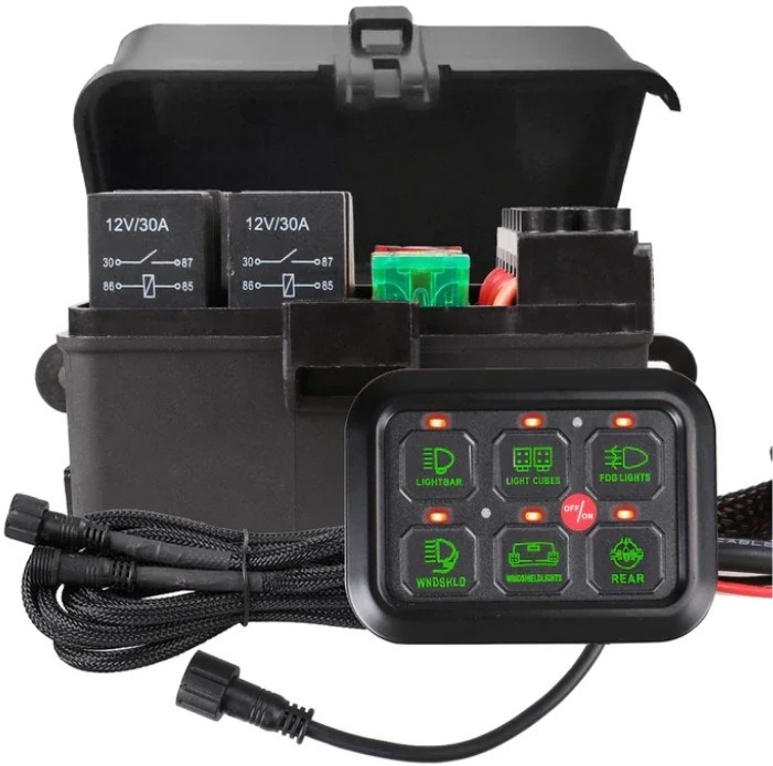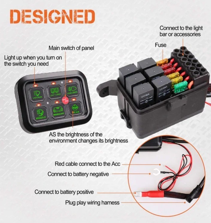 スイッチパネルを車両に設置すると,移動中に必要な運転補助装置 (オフロード照明,ディフロック,スワイバー断路,ロックライトなど) に簡単にアクセスできます.それは補助電源のために理想的です. それは,あなたがそれを使用しているときに,空気圧縮機などの高電力装置を 切り開くための別のリレーのトリガーとしても使用できます
